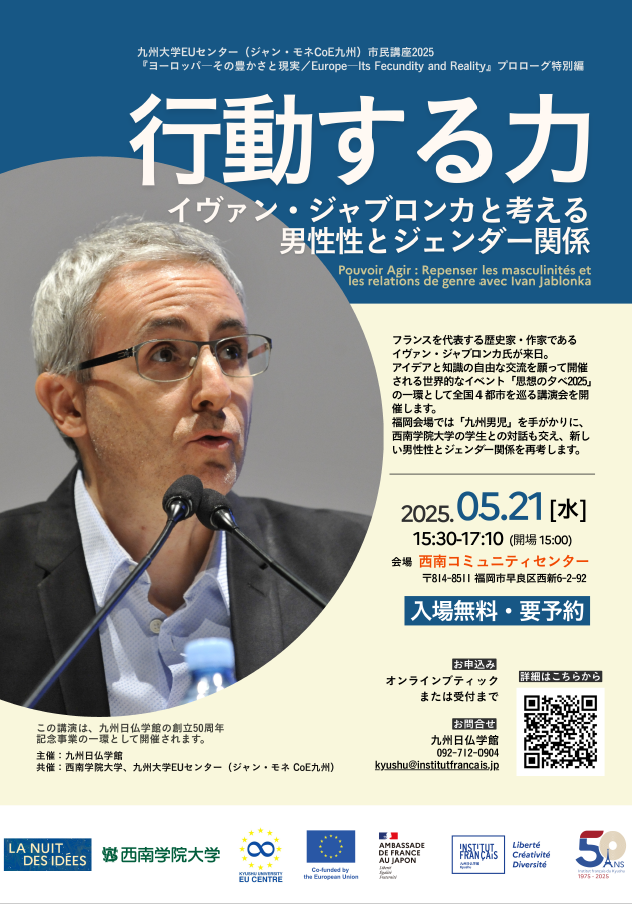 【九州大学EUセンター市民講座2025プロローグ特別編】<講演会>行動する力:イヴァン・ジャブロンカと考える男性性とジェンダー関係(主催:九州日仏学館、共催:九州大学EUセンター、西南学院大学)「思想の夕べ2025」の一環として、アンスティチュ・フ... -